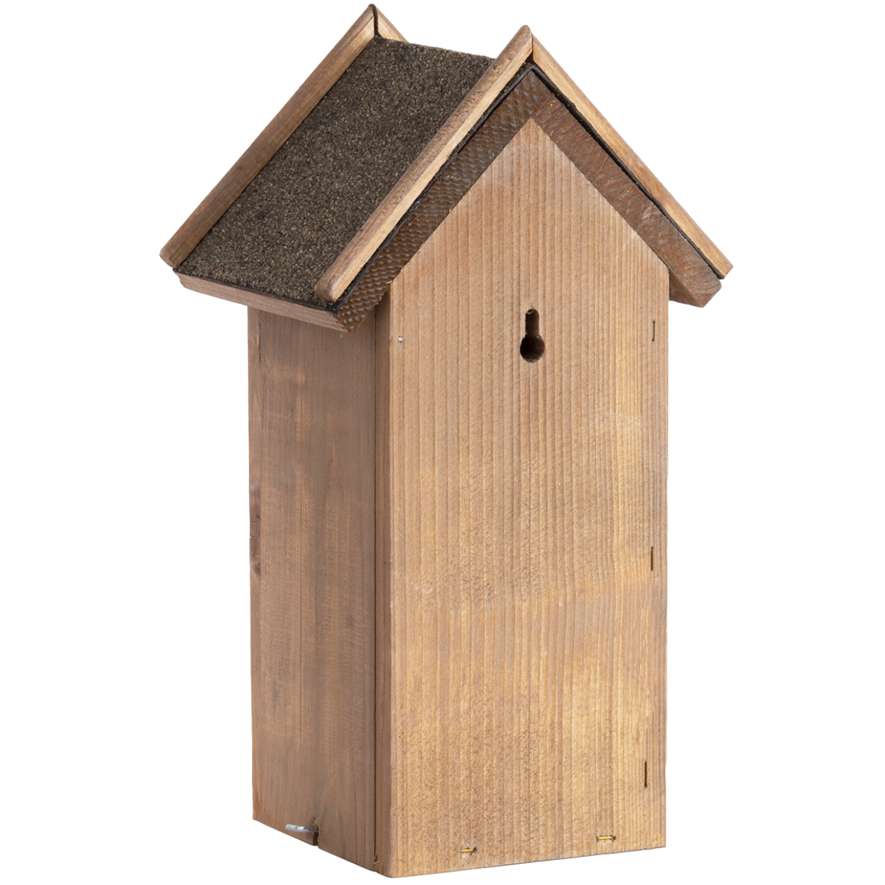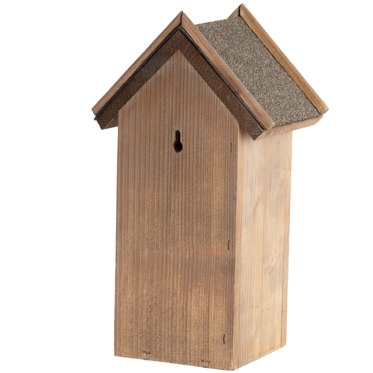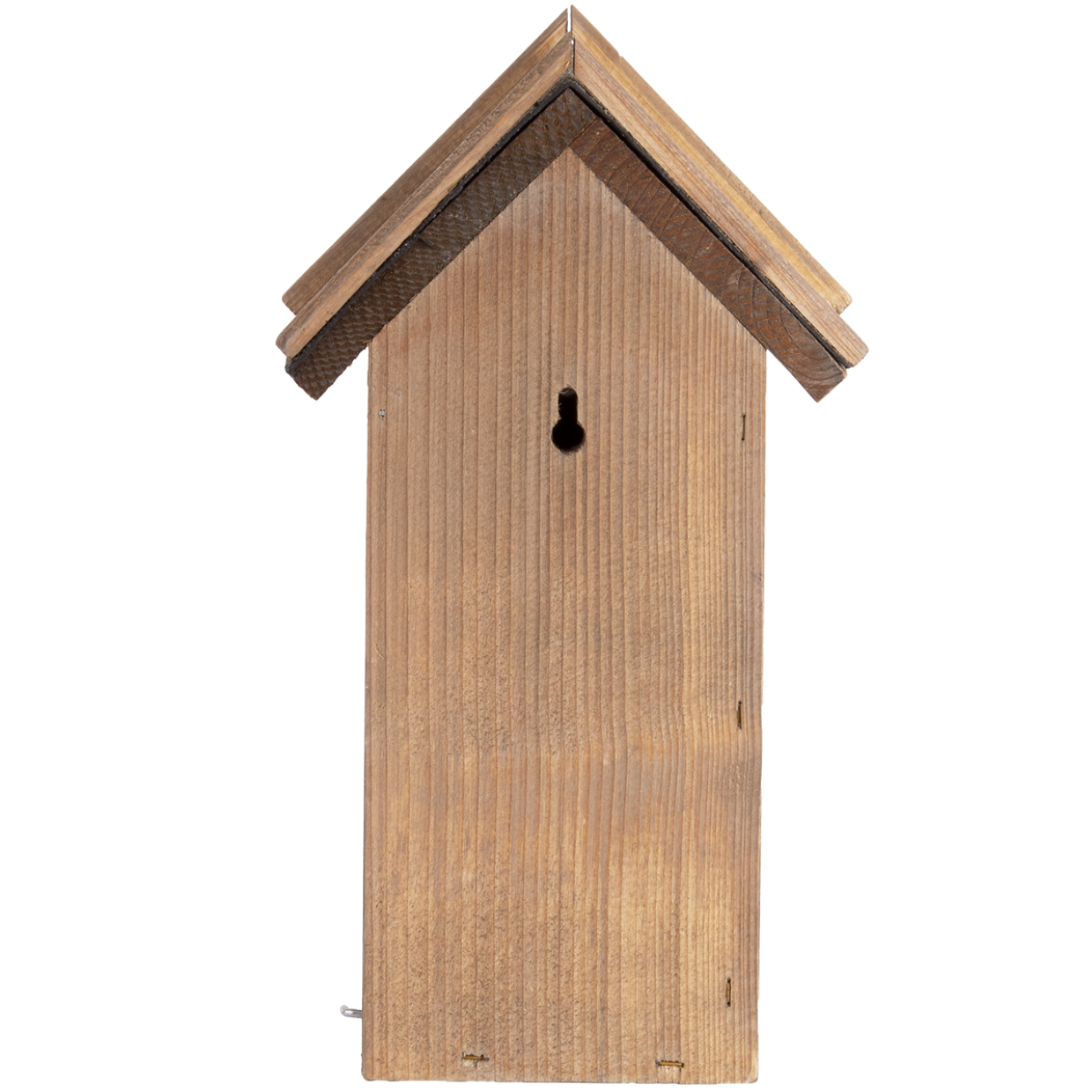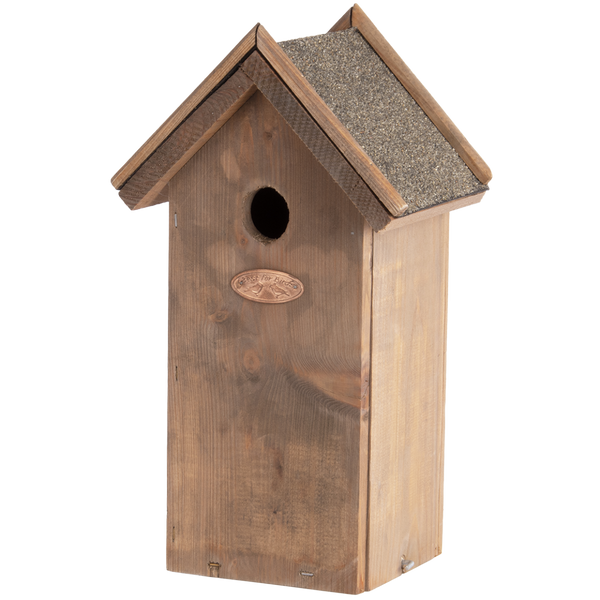 In deze fraaie antiek-wasbruine nestkast zullen in het bijzonder de koolmezen zich erg thuis voelen. Het beste is om deze nestkast minimaal 1,8 meter van de grond op te hangen, aan de noordzijde van een boom, in verband met eventuele regen.Het vogelhuisje heeft een bitumen dak zodat deze optimaal beschermd is tegen de weersomstandigheden.