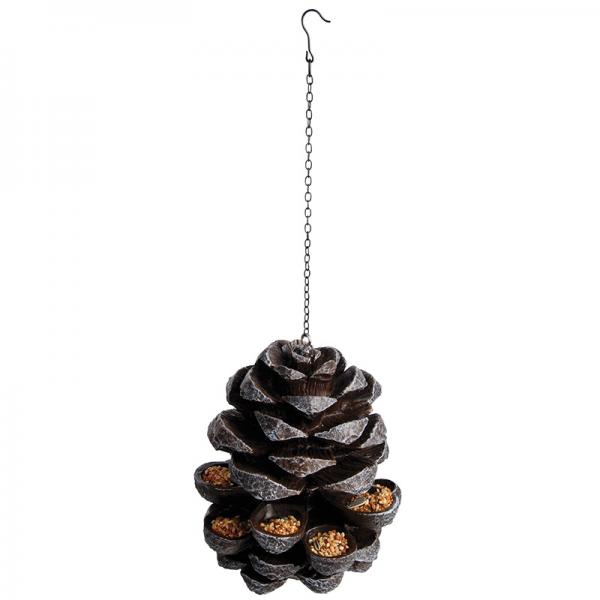 Van kunsthars gegoten voederdennenappel van het merk Esschert Design is voorzien van metalen ketting en haakje om te hangen. Vul de dennenappel met strooivoer en de vogels zullen u gedurende de winter zeer danbaar zijn! Afmetingen: ø 20 x 23 cm.