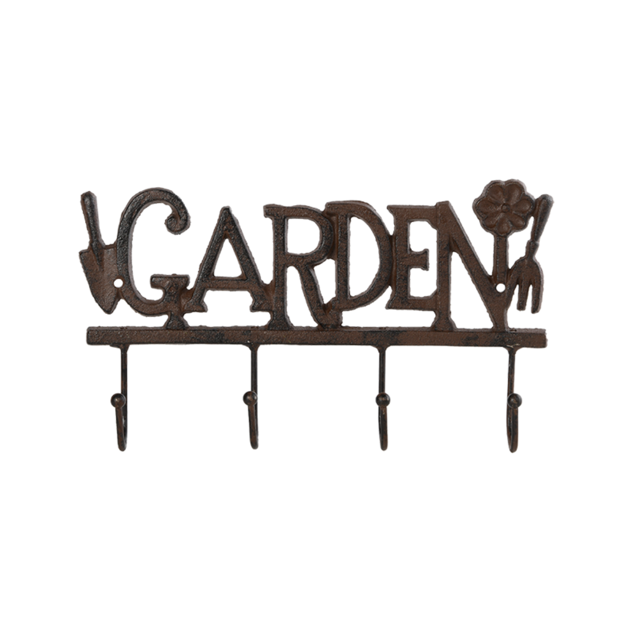 Deze rustieke gietijzeren hanger kan dankzij de twee ophanggaten eenvoudig gemonteerd worden. Aan de vier haken kan gereedschap worden opgehangen maar uiteraard ook allerlei andere spullen.