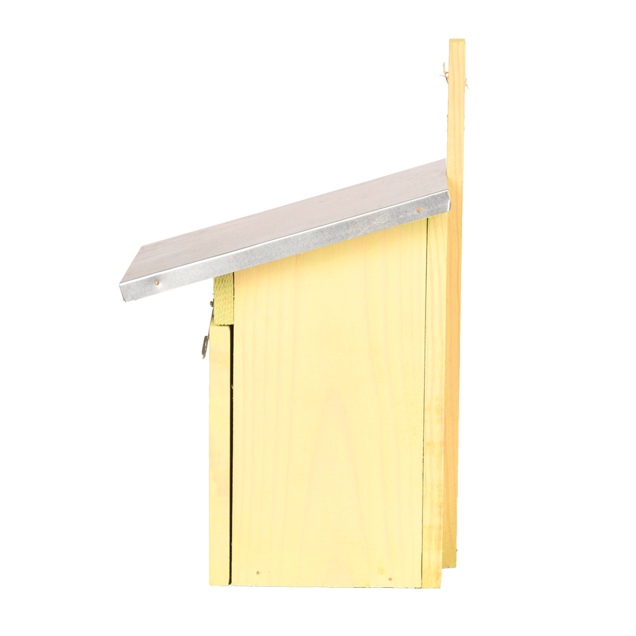 Dit koolmees vogelhuisje van Esschert Design Best for Birds is speciaal ontworpen voor de koolmees andere kleinere tuinvogels kunnen het vogelhuisje ook bewonen. Het materiaal waarvan dit vogelhuisje is gemaakt is FSC-gecertificeerd vurenhout en zink. Door de hoge kwaliteit van het hout is dit vogelhuis zeer duurzaam. Het invlieggat is vormgegeven voor de koolmees. Door vogelproducten aan te brengen in uw tuin creeërt zowel in de zomer als in de winter een gezellige sfeer in uw tuin uiteraard ook te gebruiken op uw patio, terras of uw balkon.Het vogelhuisje is eenvoudig te monteren aan de muur, schutting of boom. Ook is deze door het materiaal licht van gewicht en is hij eenvoudig te reinigen. Wij raden u aan de nestkast schoon te maken na de broedperiode bijvoorbeeld schoonmaken in de herfst.U kunt het vogelhuisje het beste 1,8 meter boven de grond ophangen aan de noordzijde niet in de felle zon. Als u het vogelhuisje het hele jaar door in de tuin wilt laten hangen wordt het blootgesteld aan allerlei weersomstandigheden, wij raden u daarom aan het vogelhuisje te behandelen met lak botenlak. Gebruikersvoordelen: FSC-gecertificeerd hout Aantrekken en behouden van de koolmees in uw tuin Natuurlijke uitstraling Eenvoudig te bevestigen Onderhoudsvriendelijk