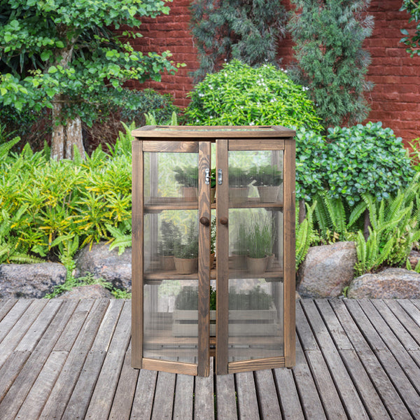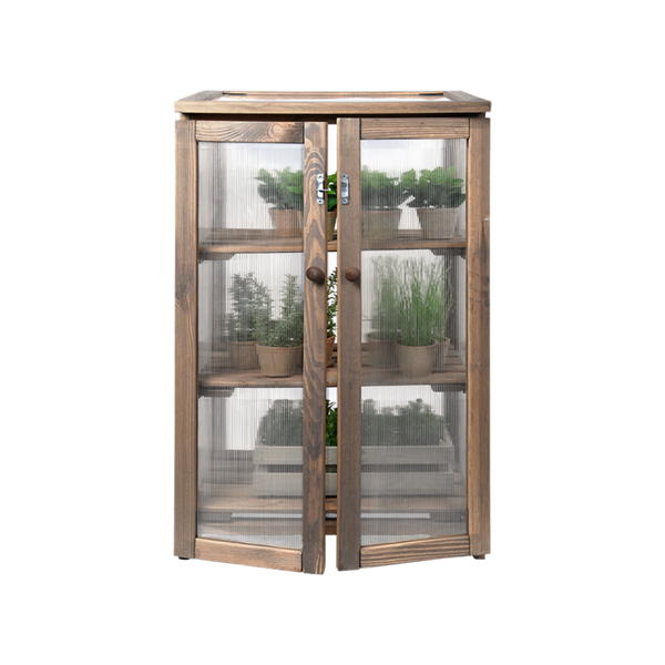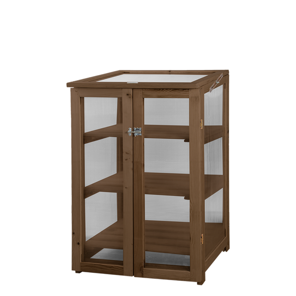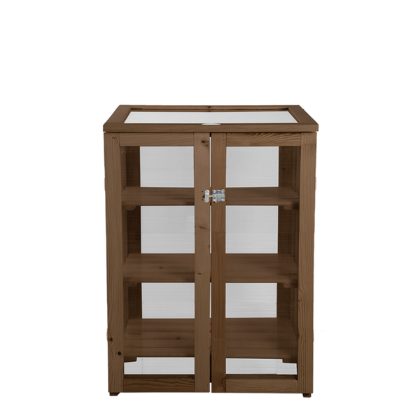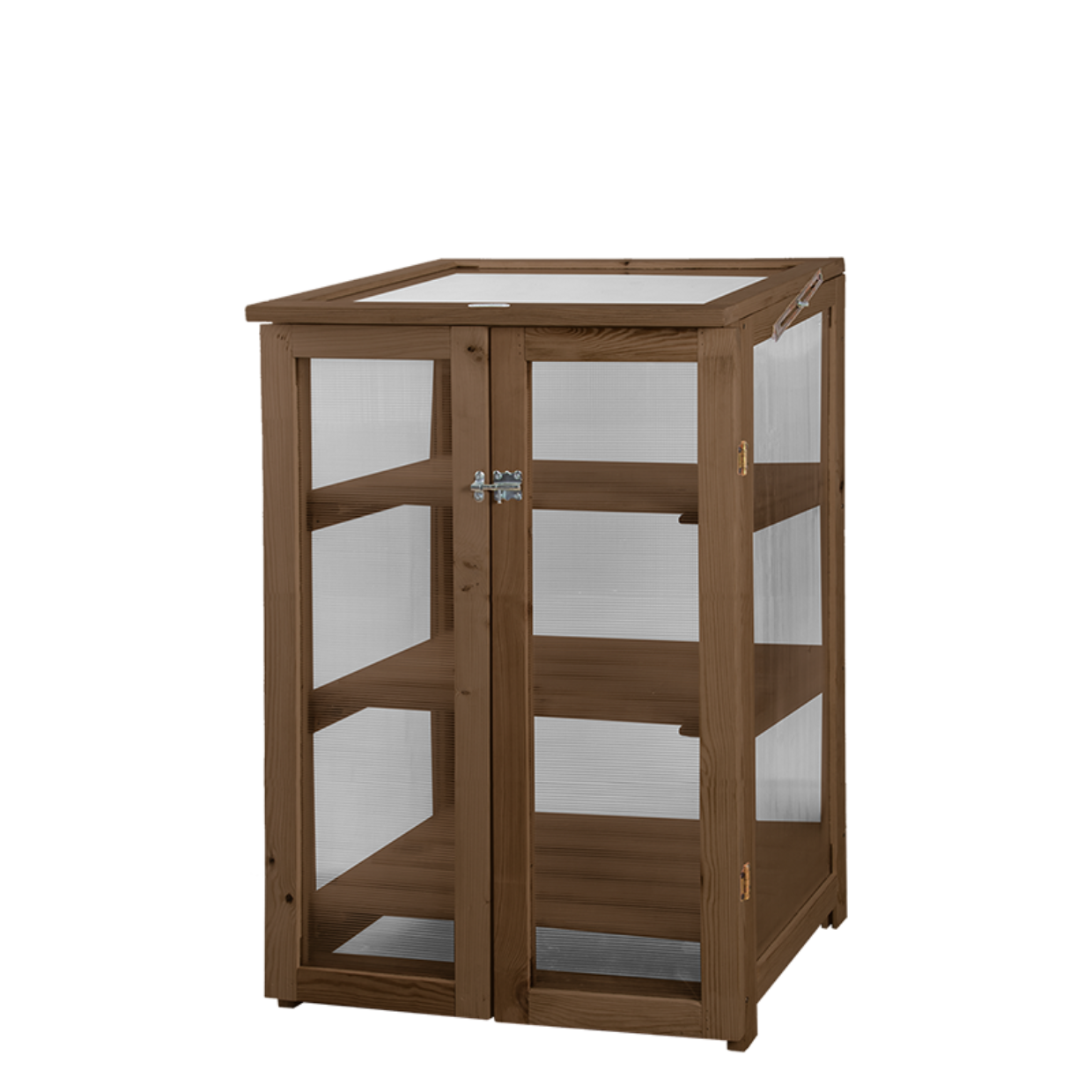 Deze kas is voorzien van polycarbonaat ramen en heeft twee schappen. De polycarbonaat ramen verstrooien het licht waardoor planten niet (snel) verbranden. Het dak van de kas kan worden geopend voor een extra "boost" zonlicht.