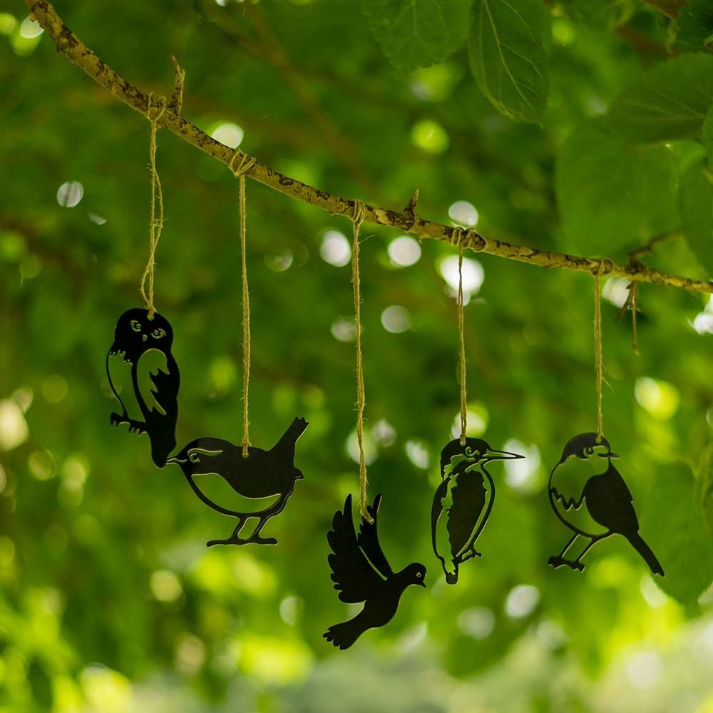 Versier uw tuin met deze set metalen mini vogels. Hang ze op in een boom of fleur er een saaie schutting mee op. Een andere leuke plek om van deze vogelset te geniet is voor het raam. De set bevat 5 verschillende vogel silhouetten, te weten: grote bonte specht, uil, roodborst, winterkoning en een duif.
