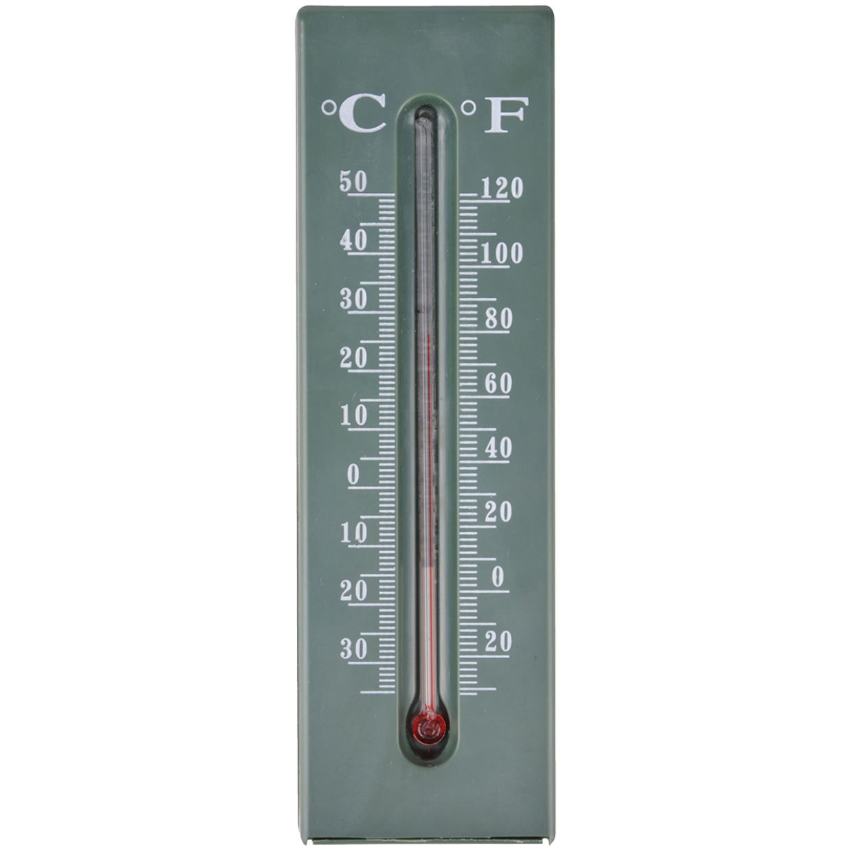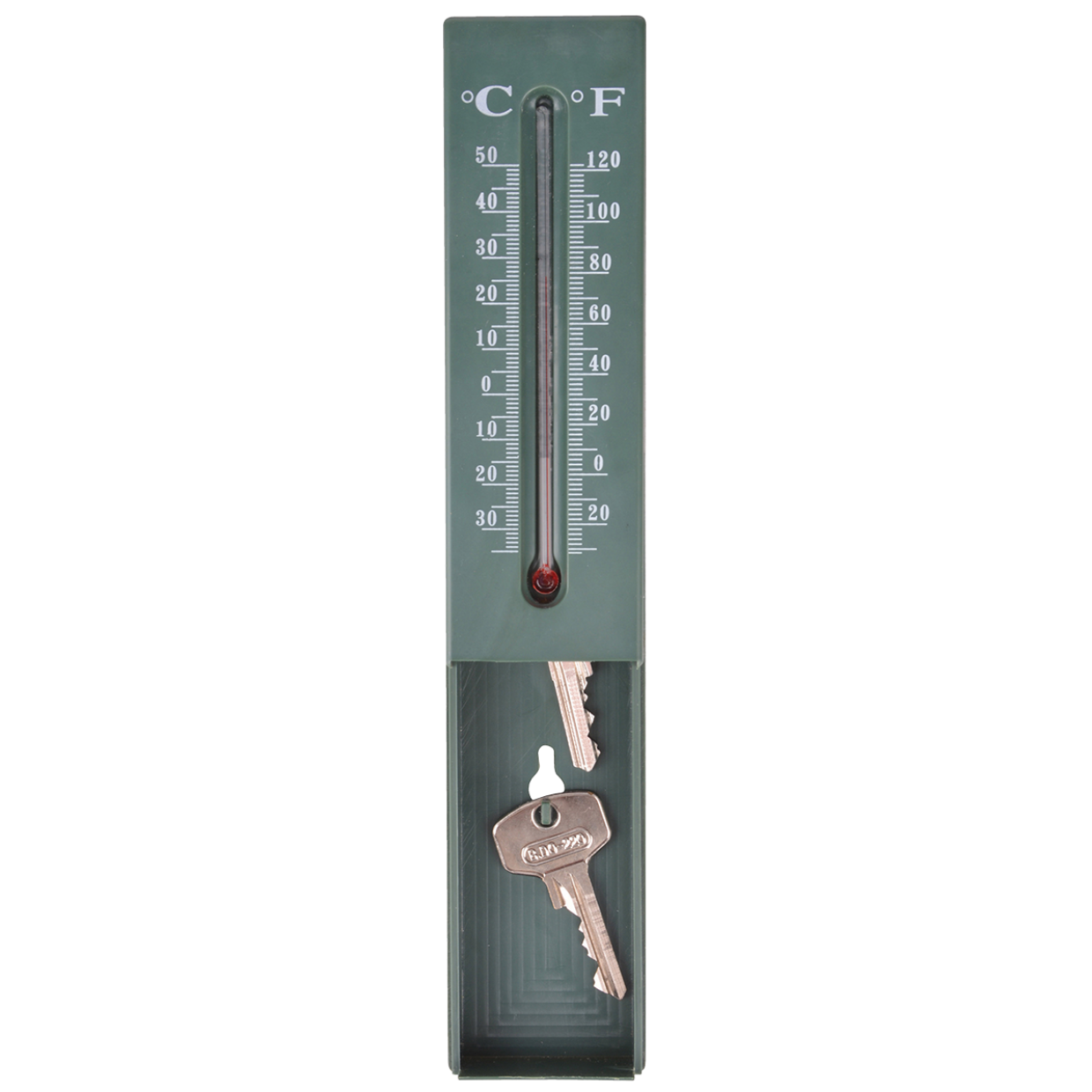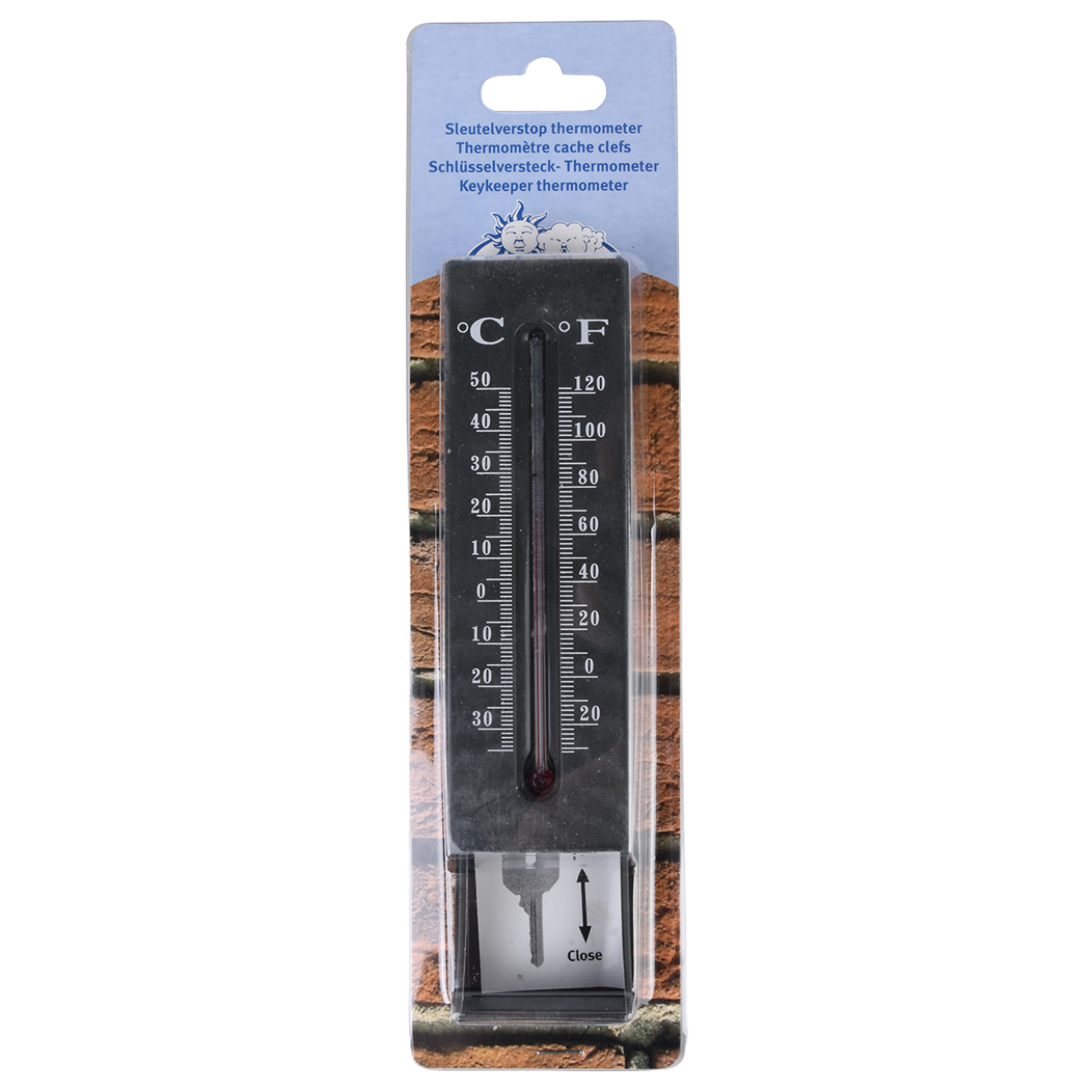 Deze muurthermometer heeft een geheim, de voorkant kan naar boven worden geschoven waardoor twee haken zichtbaar worden die een ideale verstopplaats voor sleutels bieden. De thermometer laat zowel de temperatuur in Celsius (van -30 tot +50) als in Fahrenheit (-22 tot +122) zien.