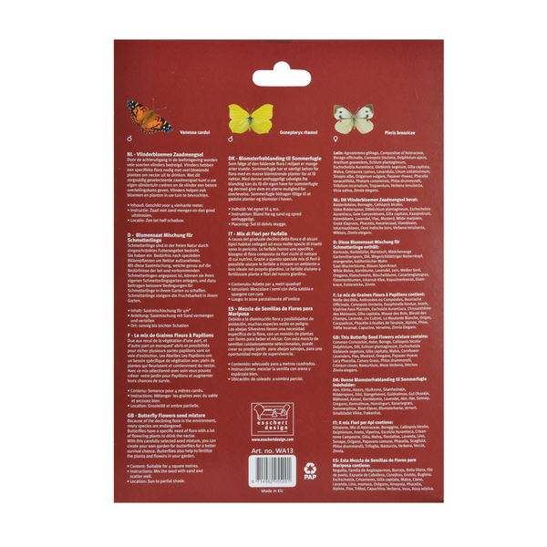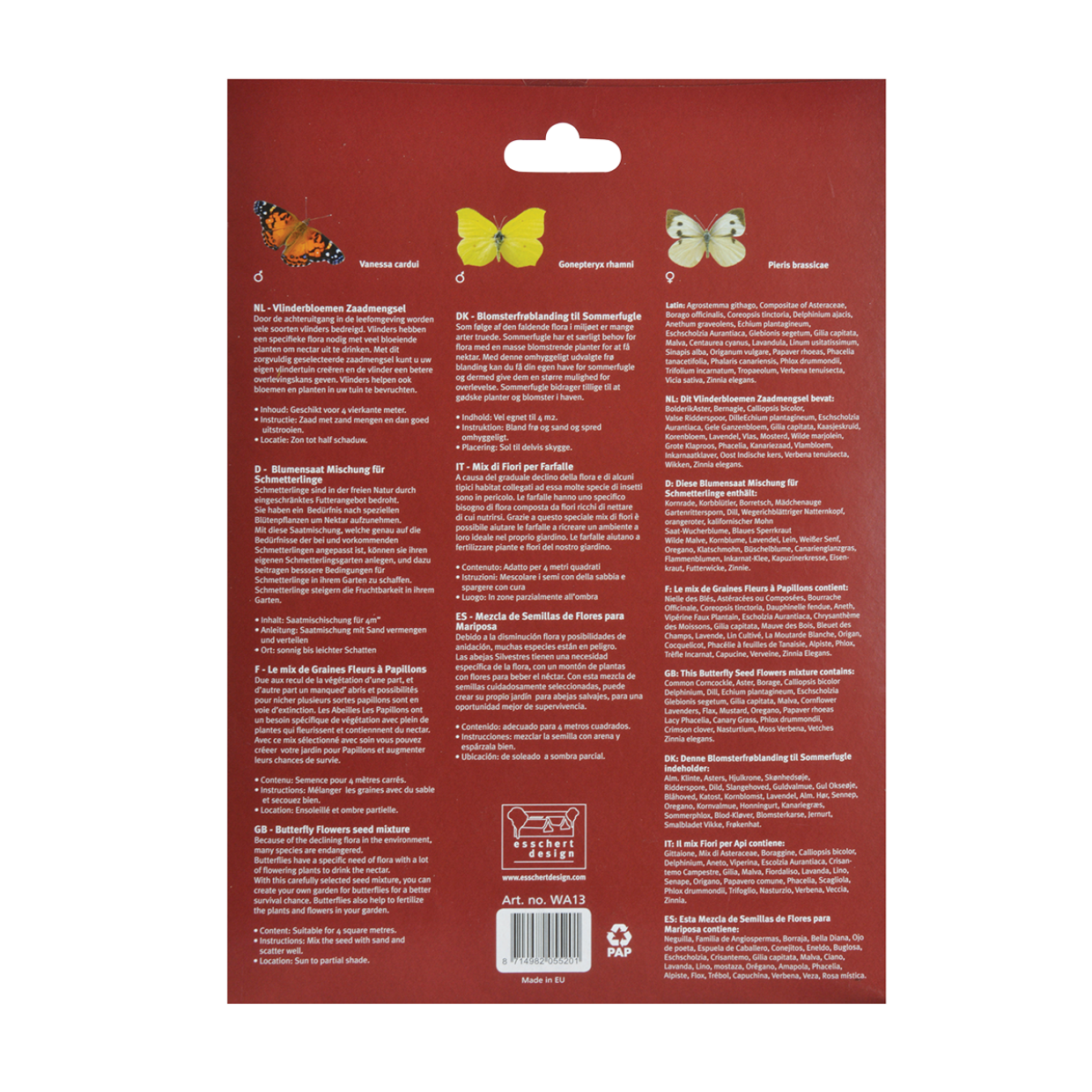 Vlinders zijn bijzonder om na te kijken, door de motieven en kleuren op hun vleugels. Door de achteruitgang in de leefomgeving worden vele soorten vlinders bedreigd. Vlinders hebben een specifieke flora nodig met veel bloeiende planten om nectar uit te drinken. Met dit zorgvuldig geselecteerde zaadmengsel kan een eigen vlindertuin gecreëerd worden en de vlinders een betere overlevingskans geven. • geschikt voor 4 vierkante meter• het zaadmengsel bevat dille, groot kaasjeskruid, bernagie, echte lavendel, rode klaver, gewone rolklaver, witte honingklaver, vicia sativa, witte mosterd, bolderik, coreopsis, chinese aster, korenbloem, gele ganzenbloem, hondstong, ridderspoor, echium plantagineum, slaapmutsje, schermscheefbloem, roodbloeiend vlas, vlas, grote klaproos, kanariegras, vlambloem, welriekende reseda, Oost-Indische kers, kruijpend ijzerhard, dahliabloemige zinnia, boekweit, phacelia Material: ZaadFormaat: 21,0x0,7x29,7 cmGewicht: 0.33 Kgsku: WA13